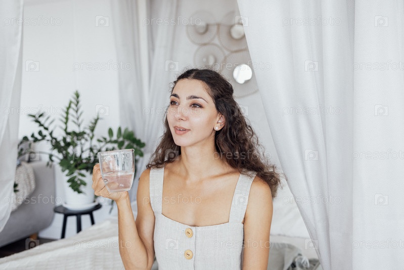 Очаровательная кудрявая брюнетка в льняном сарафане держит прозрачную чашку и пьет воду