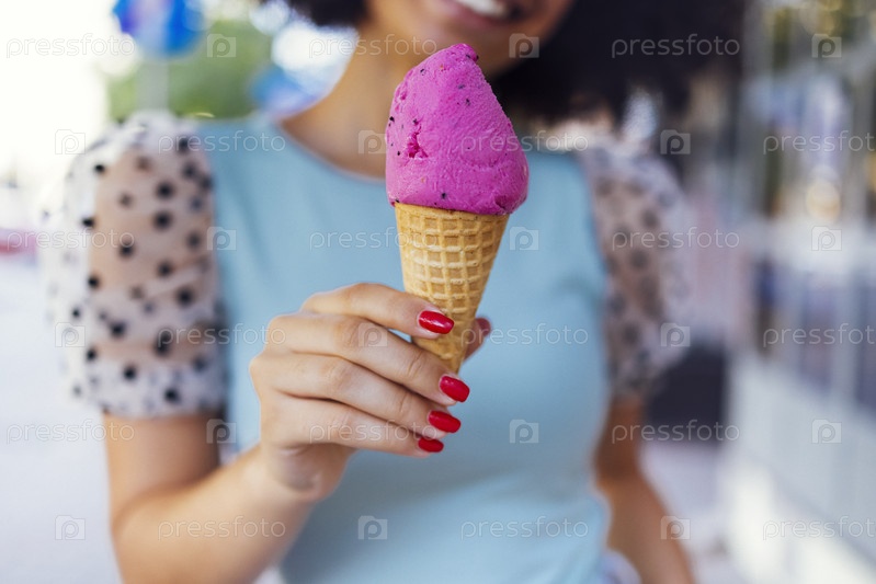 Улыбающаяся милая девушка смешанной расы, идущая по улице и держащая розовое мороженое