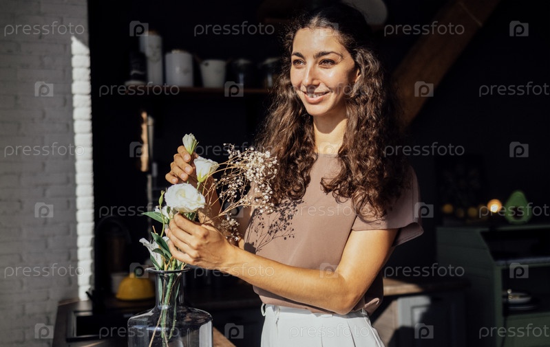 Очаровательная кудрявая брюнетка в повседневной одежде собирает букет в столовой