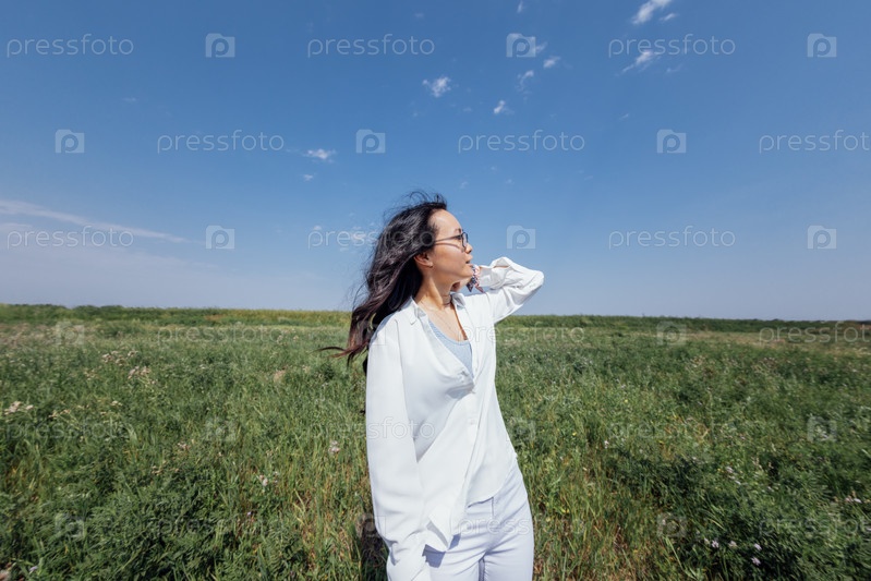 Азиатская женщина в очках улыбается на фоне голубого неба и зеленой густой травы