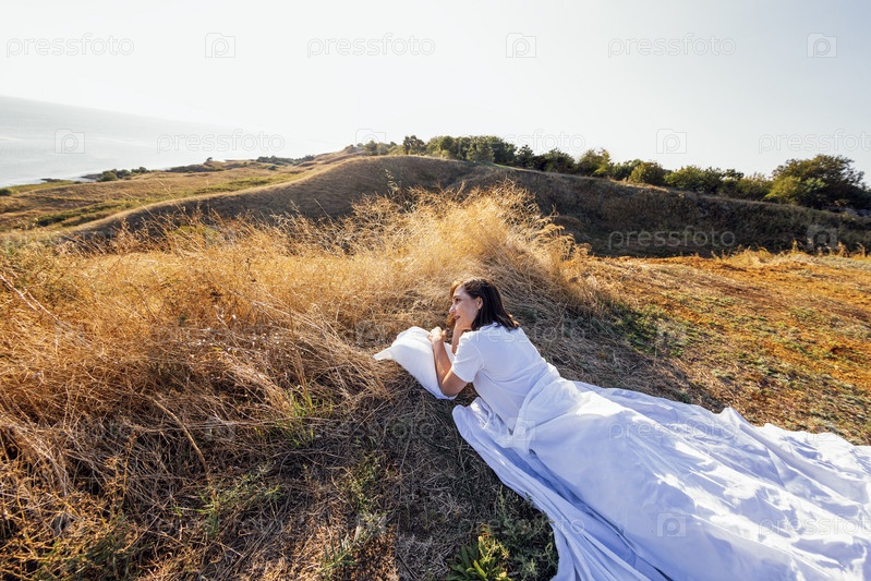 Молодая женщина в белой одежде лежит на белой простыне и подушке в поле среди сухой травы. Девушка расслабляется и отдыхает на природе
