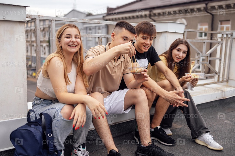 Четверо подростков сидят на парапете крыши дома и едят азиатскую еду. Две молодые пары перекусывают фаст-фудом и веселятся вместе