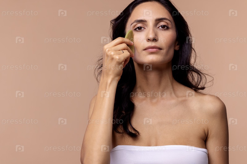 Студийный портрет молодой женщины с идеальной кожей и волосами, держащей скребок гуаша из натуральных камней
