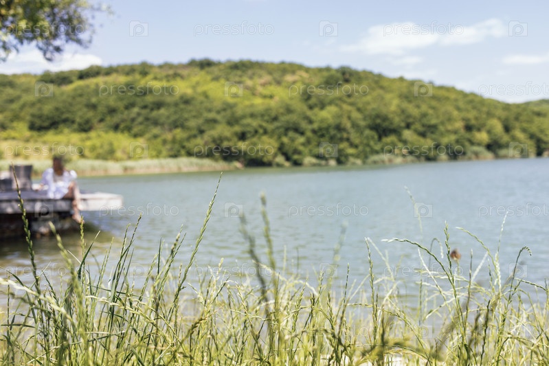 Красивый пейзаж с озером. Зеленые холмы, вода и деревянный пирс с девушкой не в фокусе