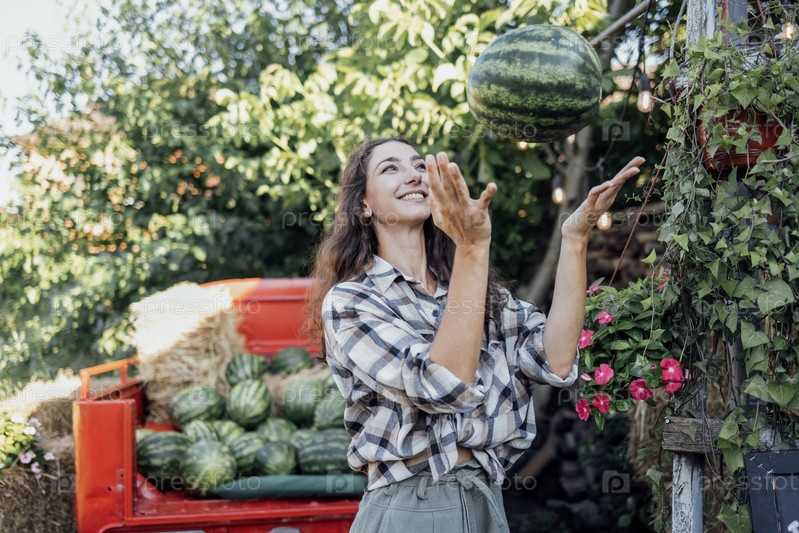 Очаровательная улыбающаяся женщина в повседневной одежде бросает арбуз на улицу. Кудрявый молодой фермер собирает свежие вкусные ягоды и фрукты