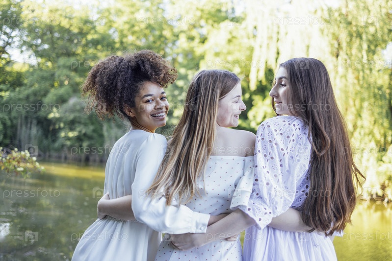 Три симпатичные многорасовые подростки в белых элегантных платьях обнимаются и смеются