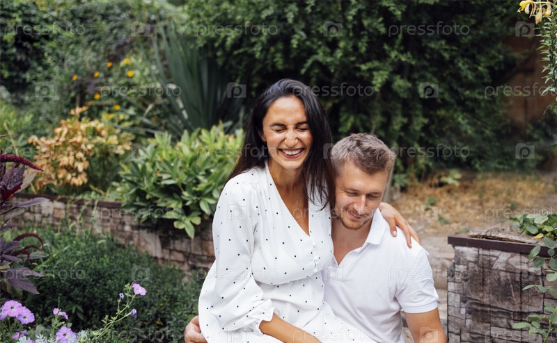 Портрет молодой улыбающейся влюбленной пары на фоне сада или природы
