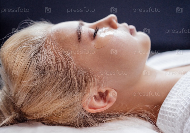 Красивая блондинка в халате лежит с силиконовыми повязками под глазами в спа-салоне или клинике
