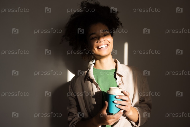 Привлекательная молодая девушка смешанной расы держит чашку кофе и улыбается