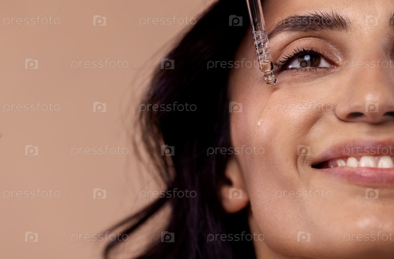 Крупный план очаровательной женщины, держащей пипетку с регенерирующей сывороткой с гиалуроновой кислотой