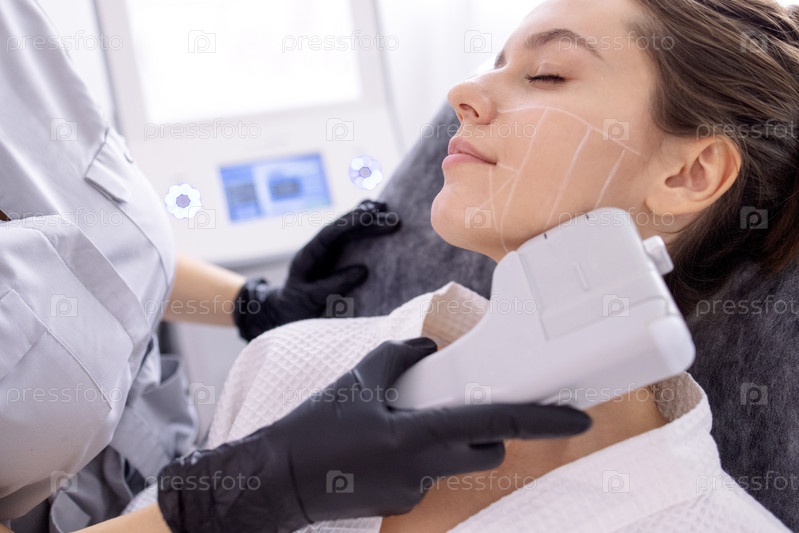Портрет расслабленной молодой клиентки, получающей ультразвуковый лифтинг-массаж лица SMAS