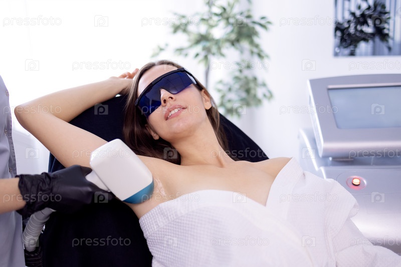 Молодая женщина получает фотоэпиляцию во время посещения центра красоты в салоне, профессиональная женщина-косметолог делает процедуру лазерной эпиляции на теле клиентов. Концепция косметологии