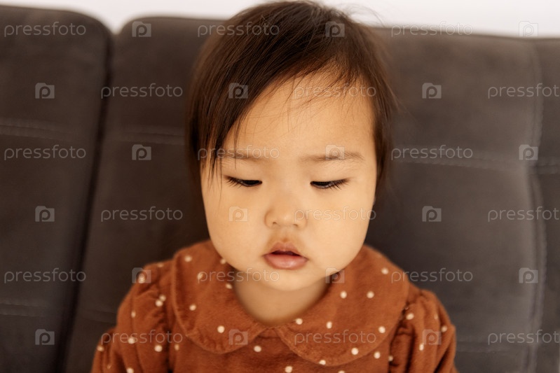 Милый восторженный корейский малыш в коричневом платье