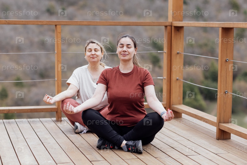 Две молодые женщины тренируются асана-йогой в парке. Улыбающиеся девушки сидят в позе лотоса