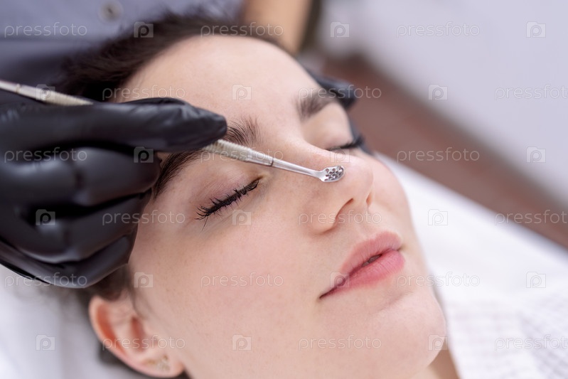 Косметолог делает чистку лба кавказской женщины