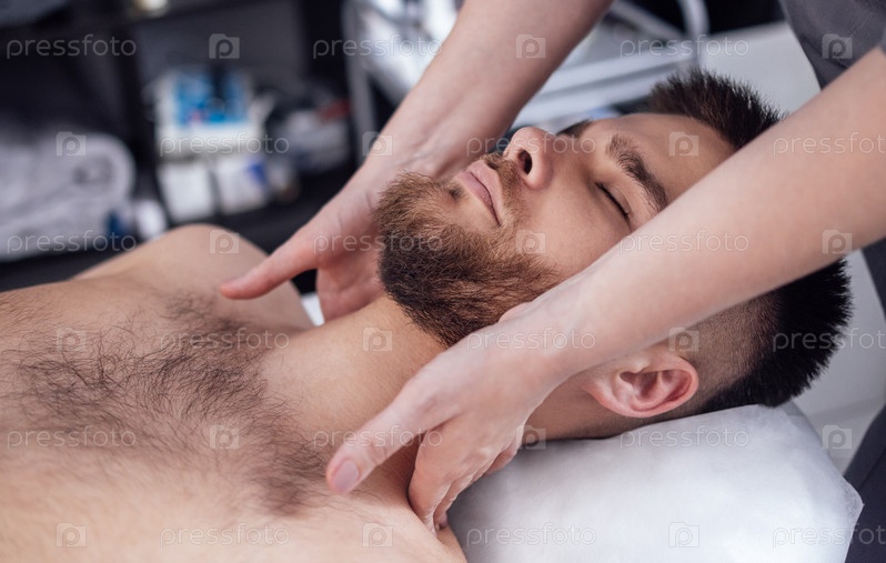 Крупным планом портрет молодого привлекательного мужчины, получающего массаж лица