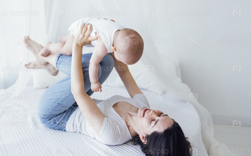 Симпатичный младенец в белом боди со своей мамой на светлом фоне. Концепция материнства