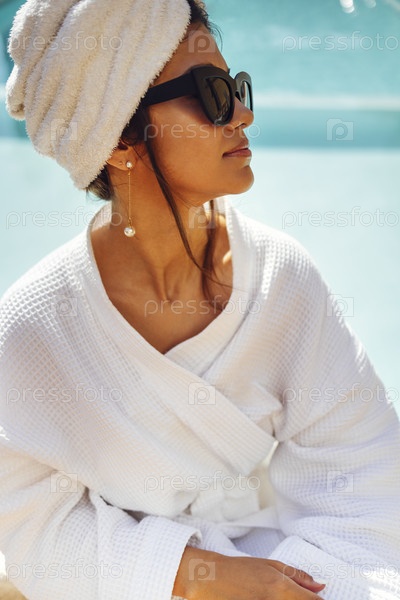 Расслабленная кавказская женщина в солнцезащитных очках и полотенце на голове сидит у бассейна. Концепция отдыха и спа