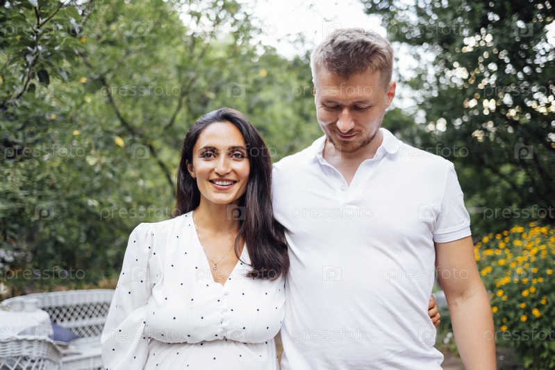 Портрет молодой улыбающейся влюбленной пары на фоне сада или природы