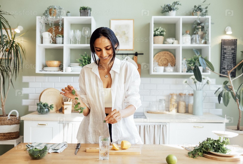 Молодая привлекательная женщина готовит вкусный свежий лимонад и нюхает лимон и мяту