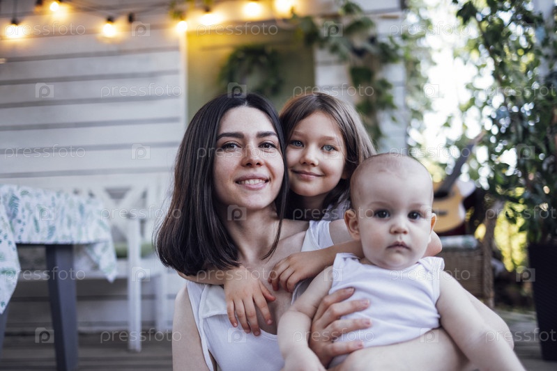 Красивая улыбающаяся брюнетка-мама с двумя милыми маленькими детьми. Счастливая семья обнимается на террасе деревянного дома в винтажном стиле