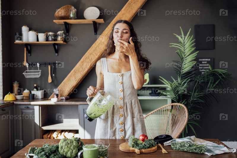 Счастливая кудрявая девушка в льняном сарафане готовит здоровый завтрак