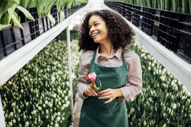 Молодая милая девушка смешанной расы в зеленом фартуке держит пионовидный тюльпан на фоне плантаций с цветами в теплице