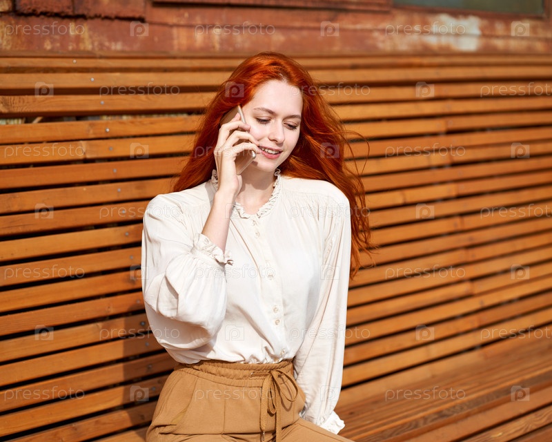 Рыжеволосая женщина разговаривает по мобильному телефону. Красивая стильная фотомодель