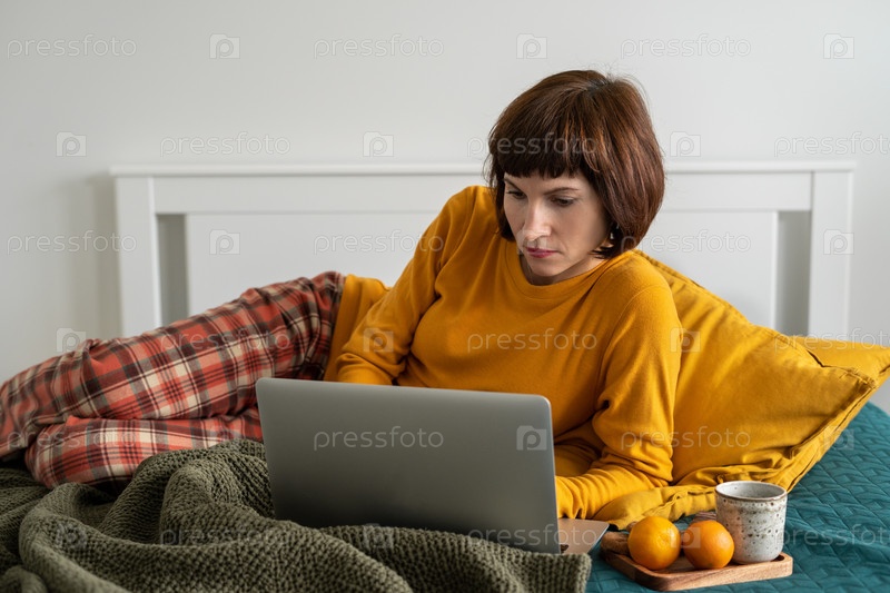 Зрелая женщина лежит на кровати в спальне и смотрит фильм на ноутбуке