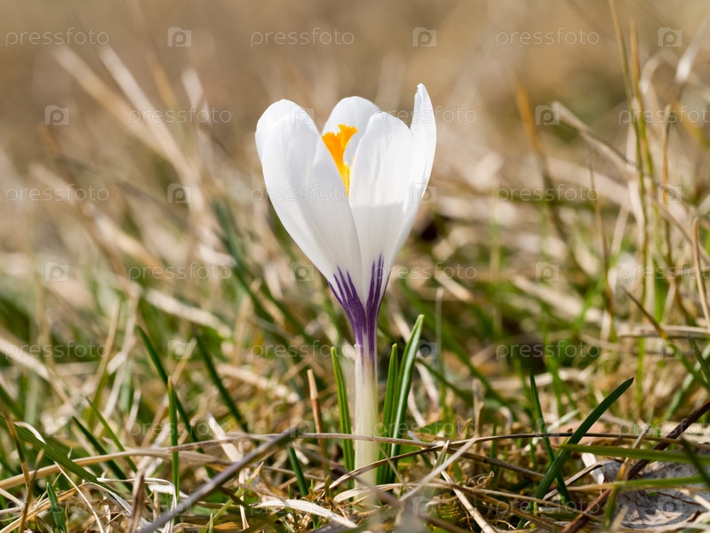 Белый крокус с оранжевой сердцевиной. Красивый цветок в начале лета