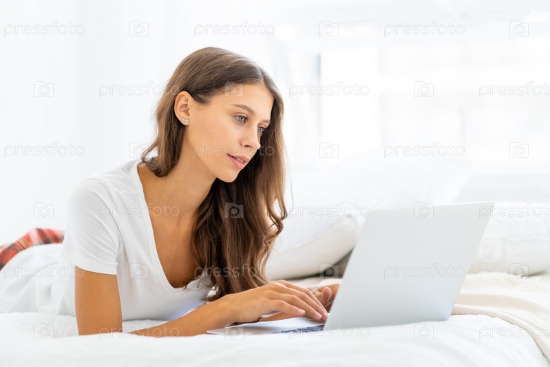 Молодая женщина работает дома, лежит на кровати в пижаме и делает покупки в Интернете