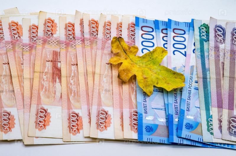 Деньги на осенние листья. Русские деньги и дубовые листья. Осенний натюрморт