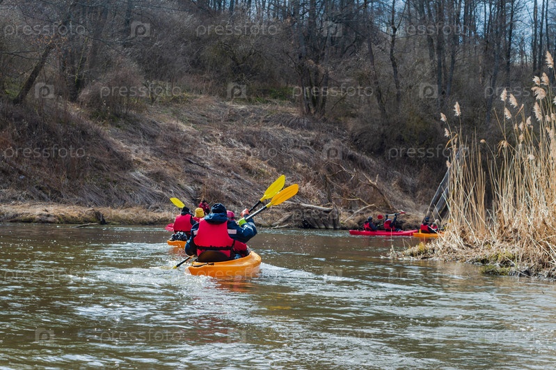 Калининград, Россия - 2022, 3 апреля: Люди в возрасте проводят весенние каникулы на природе. Каякинг весной. Активное времяпрепровождение выходного дня. Спортивный туризм