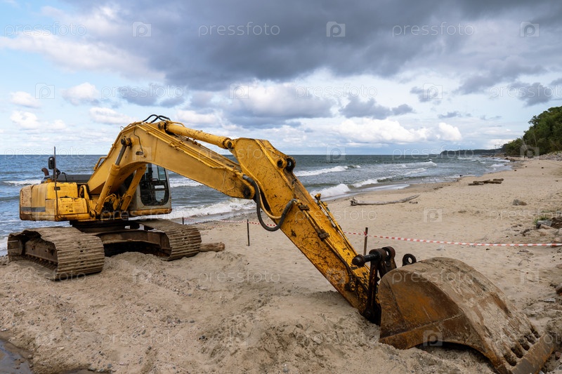 Экскаватор в море. Строительная техника на берегу моря. Строительство береговых укреплений