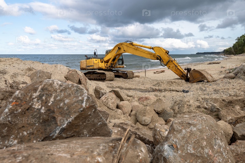 Экскаватор в море. Строительная техника на берегу моря. Строительство береговых укреплений