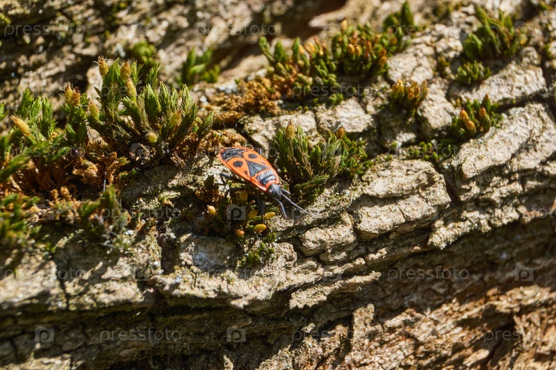 На стволе старого гниющего дерева растет мох.Весна.Клоп-солдат или красноклоп безкрылый (Pyrrhocoris apterus)