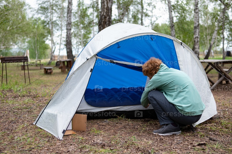 Женщина ставит палатку в лесу