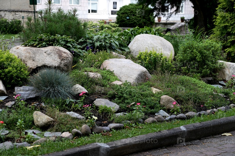 Красивый формальный сад с обеденной зоной, столом-тандыром на фоне белого куста гортензии