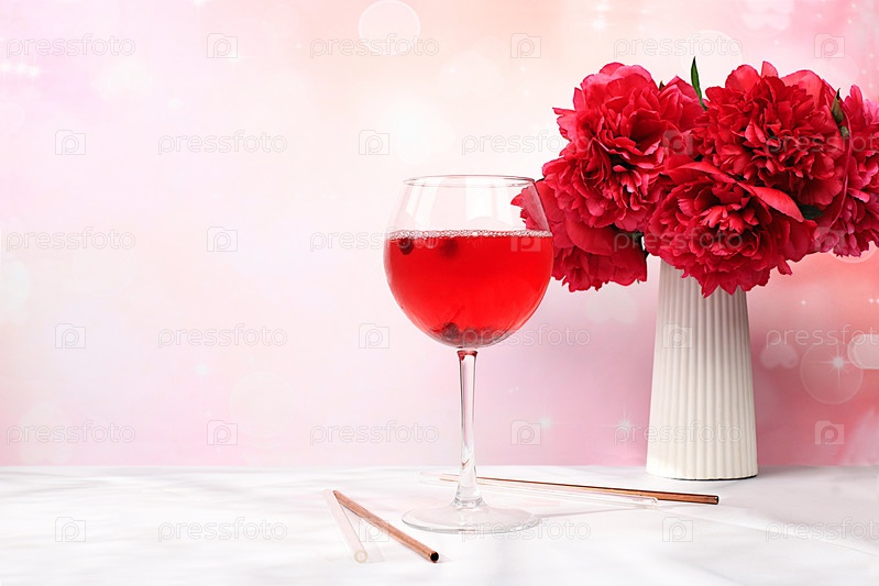Праздничный алкогольный коктейль, красное вино в бокалах на ярком фоне с букетом бордовых пионов, концепция летнего бара, алкогольные напитки на вечеринке, реклама ресторана и кафе, избирательный фокус