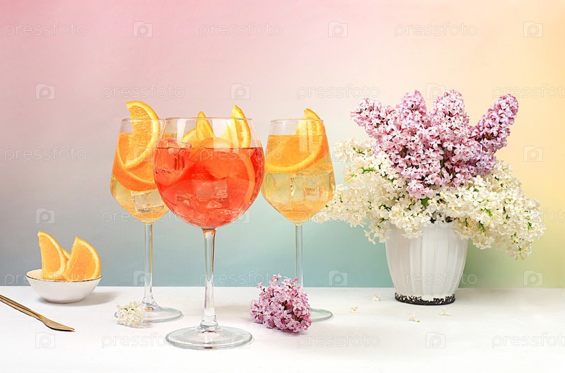 Праздничный алкогольный коктейль Aperol spritz в стаканах на ярком фоне с букетом сирен, концепция летнего бара, спиртные напитки на вечеринке, реклама ресторанов и кафе,