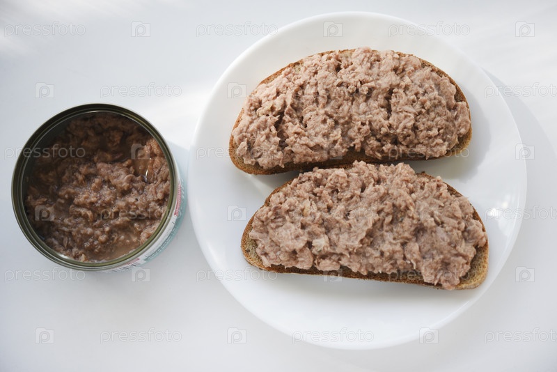 Бутерброды с мясной пастой на белой тарелке. Рыбная закуска