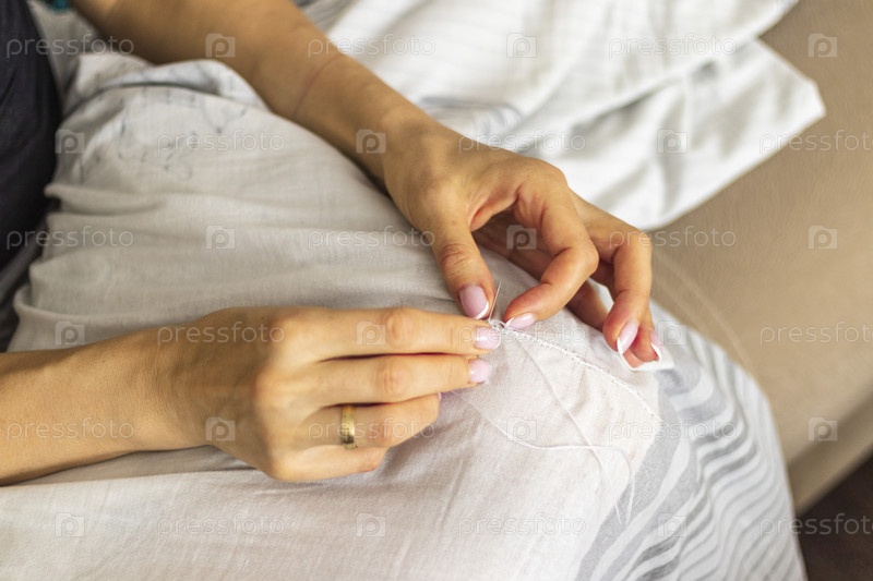 Снимок женщины с красивыми руками, зашивающей или латающей льняную ткань. Семья