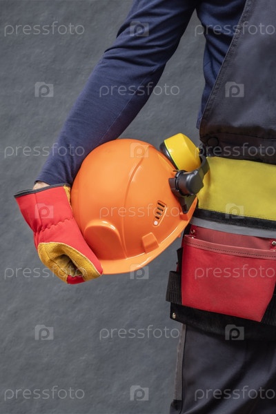 Рабочий держит шлем. концепция безопасности и здоровья труда