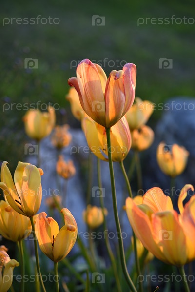 Желто-красные тюльпаны в свете заходящего солнца. Желтые цветы