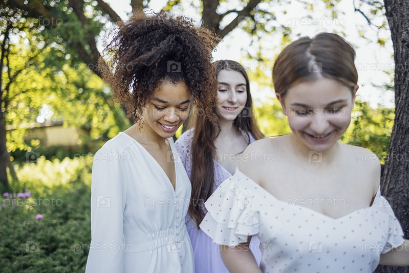 Три счастливые симпатичные улыбающиеся девочки-подростки в белых летних элегантных платьях идут по тропинке в лесу