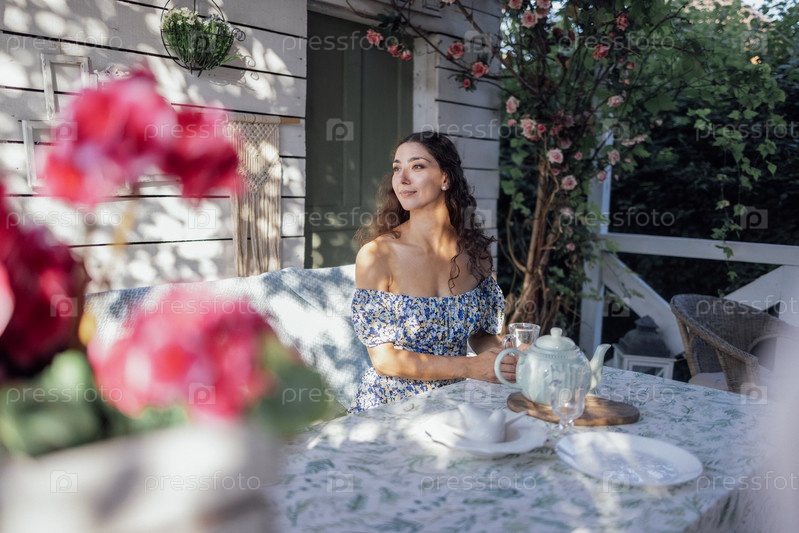 Молодая привлекательная женщина пьет чай на веранде на открытом воздухе