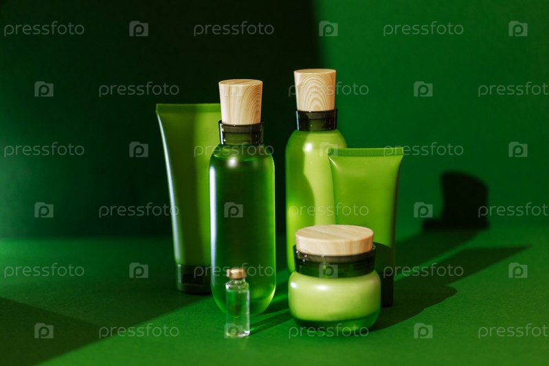 Набор макетов для косметической продукции. Мокапы представляют собой прозрачный и полупрозрачный флакон с крышкой, тюбик и баночку с кремом. Зеленый фон
