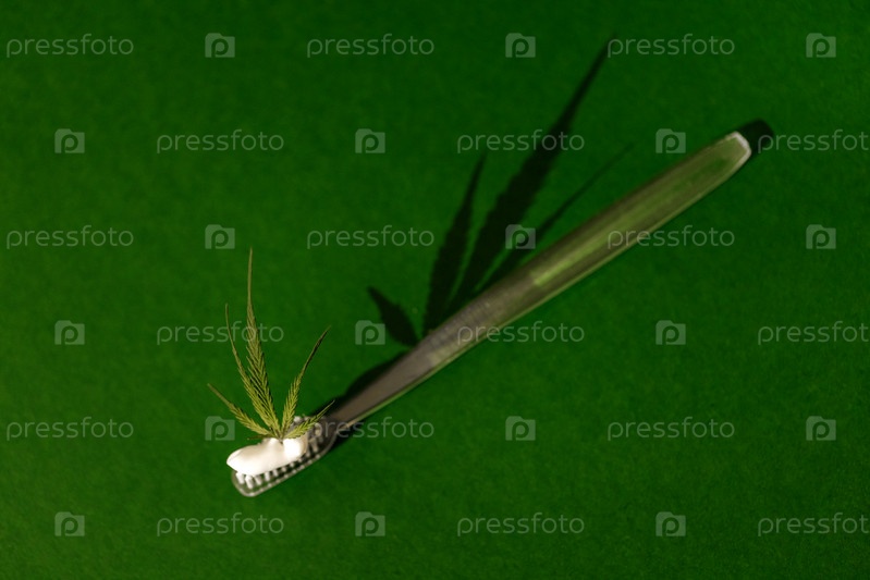 Прозрачная пластиковая зубная щетка с белой зубной пастой Cannabis CBD с листьями конопли. Зеленый изоляционный фон. Концепция здравоохранения и гигиены полости рта