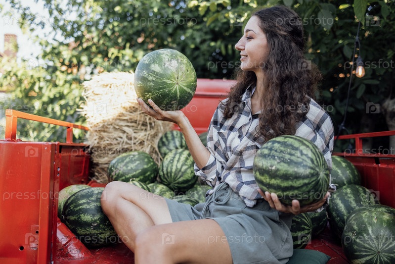 Очаровательная улыбающаяся женщина в повседневной одежде бросает арбуз на улицу. Кудрявый молодой фермер собирает свежие вкусные ягоды и фрукты. Сбор урожая. Красный грузовик с арбузами и сеном на заднем плане