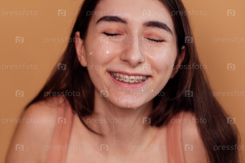 Портрет улыбающейся подростка с брекетами, умывающей лицо утром. Молодая красивая девушка с чистой свежей кожей с брызгами воды. Концепция ухода за кожей и женской красоты
